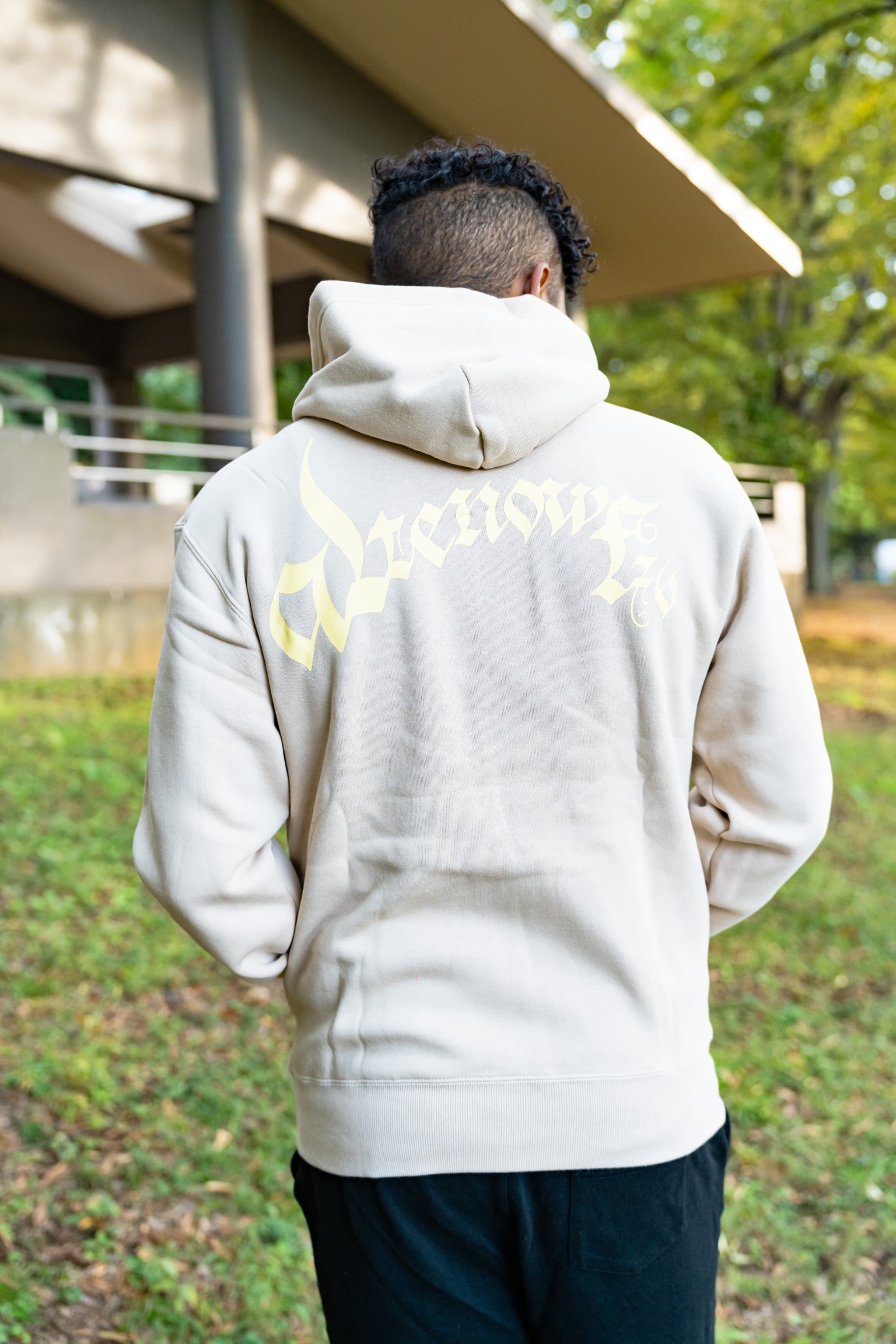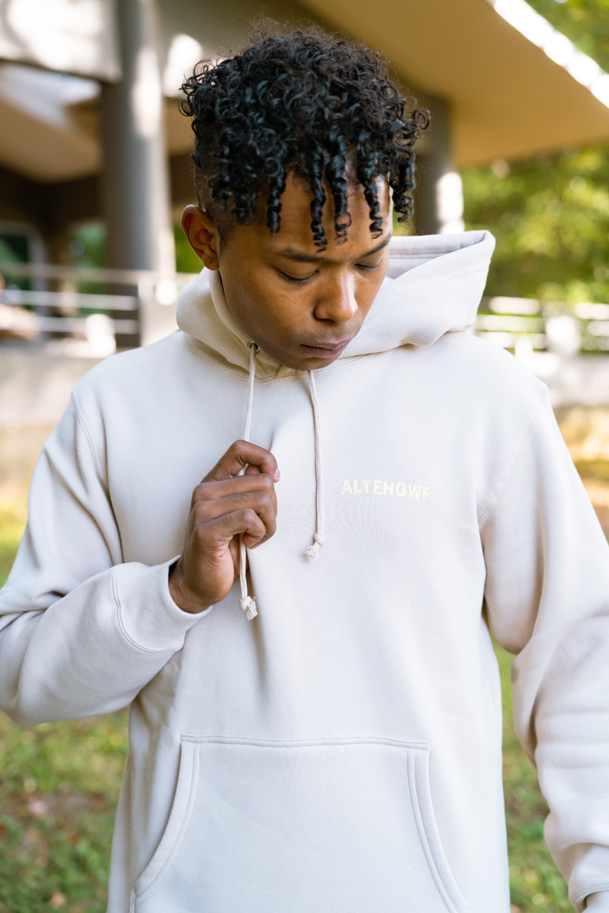 裏起毛のベージュのフーディーです。暖かな風合いと抜群のフィット感で、寒い季節でも快適に過ごせます。ALTENOWFのロゴがアクセントとなり、シンプルながらも個性的なデザインです。